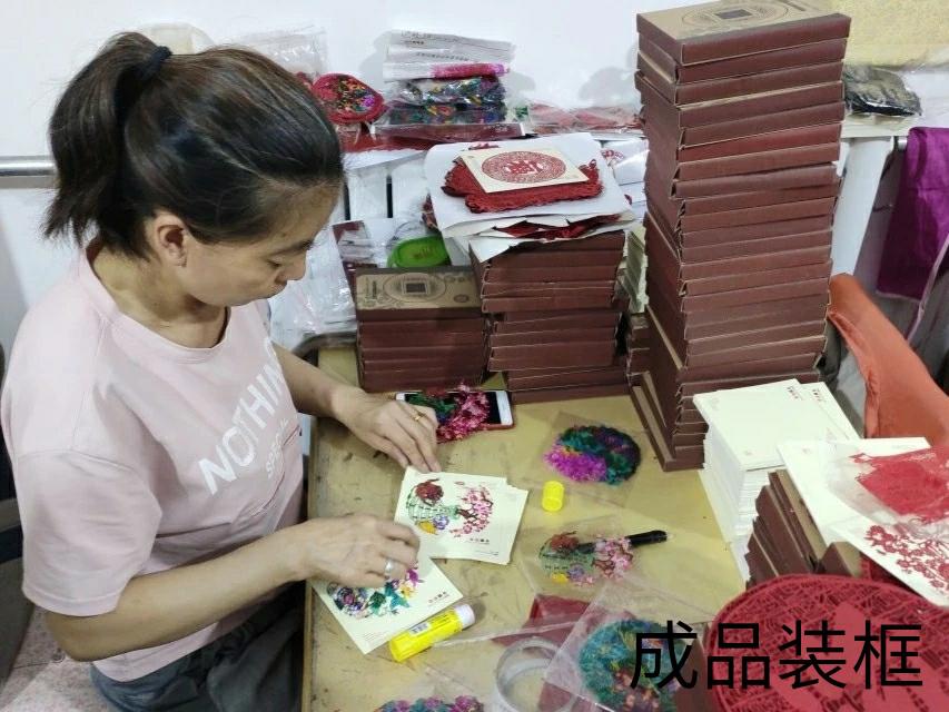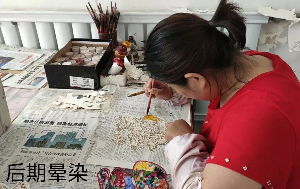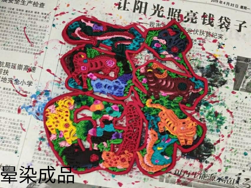 进村后通过对工作坊、厂家简单的参观,使我见识到了剪纸各个步骤以及区域划分,以及每个步骤负责的手艺人。我们蔚县人一般把剪纸称为"窗花"。蔚县剪纸以窗花见长,“天皮亮”可以说是最早的窗花形式,即在云母薄片上绘图着色进行装饰。早期当地还盛行供花鞋、荷包、枕头上刺绣用的“花样”。后来河北武强县的木版水印窗花传入,吸取其色彩特点,仿“天皮亮”透明效果,以刻代剪,形成蔚县剪纸的独特风格。蔚县剪纸以“阴刻”和“色彩点染”为主,故有“三分工七分染”之说。