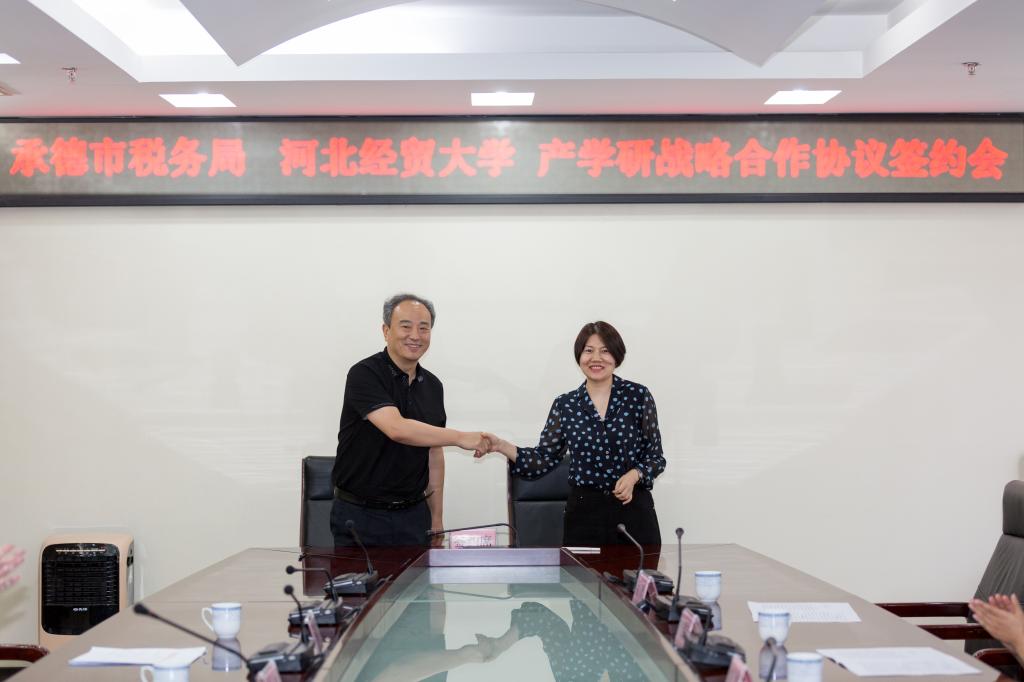院长王晓洁与承德市税务局党委书记赵波共同签署了产学研基地合作协议有效期十年。今后,双方将秉承优势互补、共同发展的原则,开展多种形式校政产学研合作,为青年学生提供广阔的实习实践平台,推动行业全面发展。