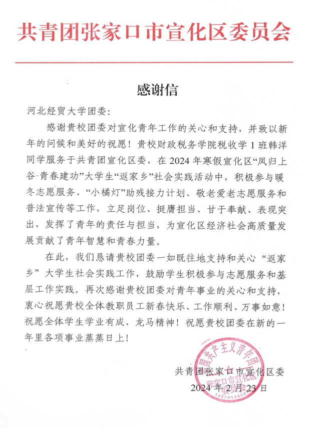 信中表示,韩洋同学服务于共青团宣化区委,在2024年寒假宣化区“凤归上谷•青春建功”大学生“返家乡”社会实践活动中,积极参与暖冬志愿服务、“小橘灯”助残接力计划、敬老爱老志愿服务和普法宣传等工作,立足岗位、挺膺担当、甘于奉献、表现突出,发挥了青年的责任与担当,为宣化区经济社会高质量发展贡献了青年智慧和青春力量。