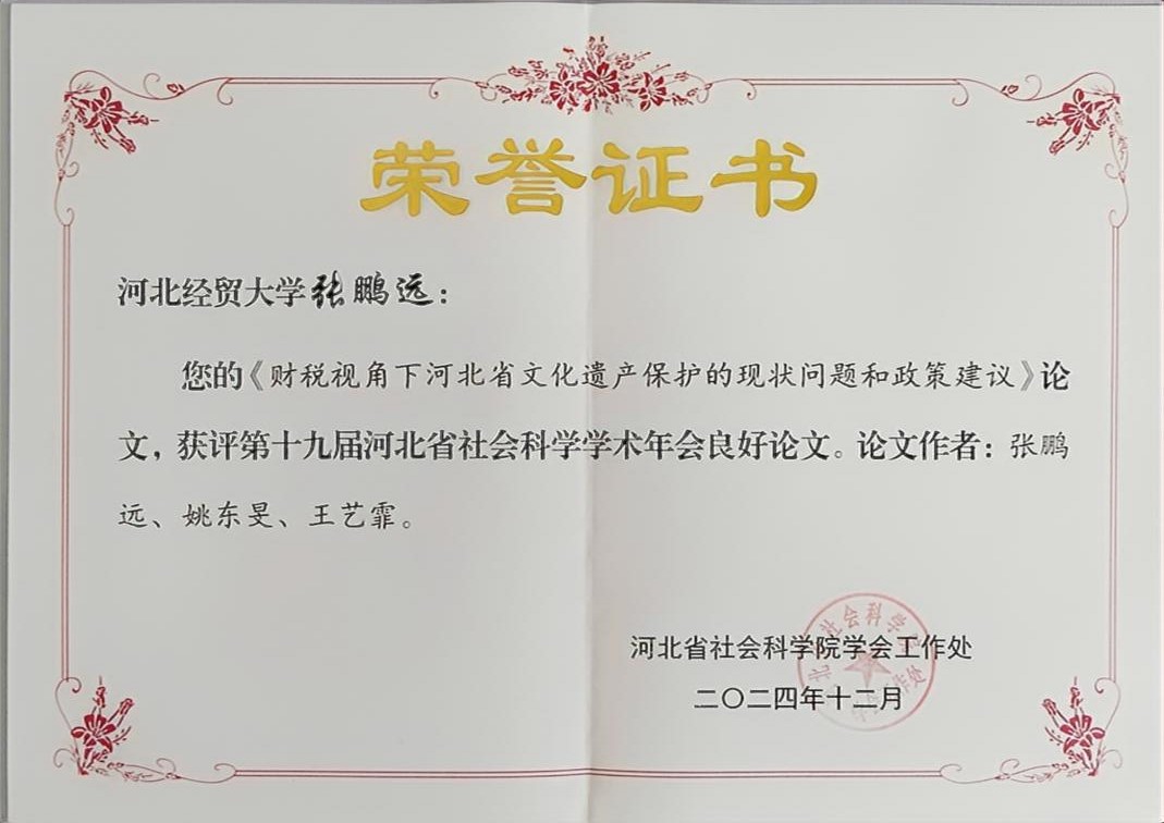 近日,Jcomic 教师张鹏远与中央财经大学姚东旻、王艺霏共同撰写的《财税视角下河北省文化遗产保护的现状问题和政策建议》,获得第十九届河北省社会科学学术年会良好论文。