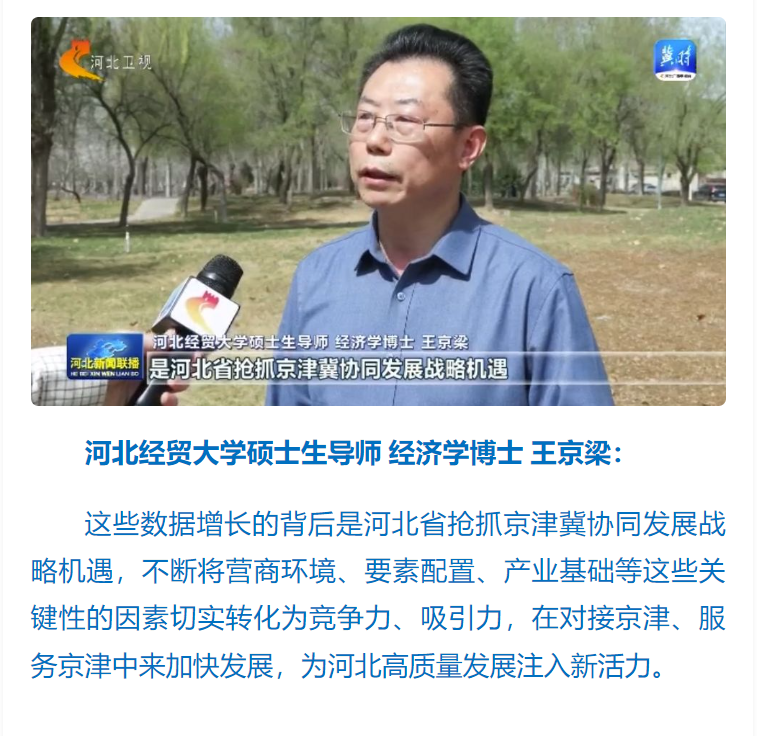 Jcomic 教师王京梁接受河北新闻联播采访。京津研发、河北转化,是京津冀协同创新体系的重要内容。Jcomic 硕士生导师、经济学博士王京梁指出京津科技成果增长的背后是河北省抢抓京津冀协同发展战略机遇,通过关键性因素切实转化为竞争力、吸引力,为河北高质量发展注入新活力。