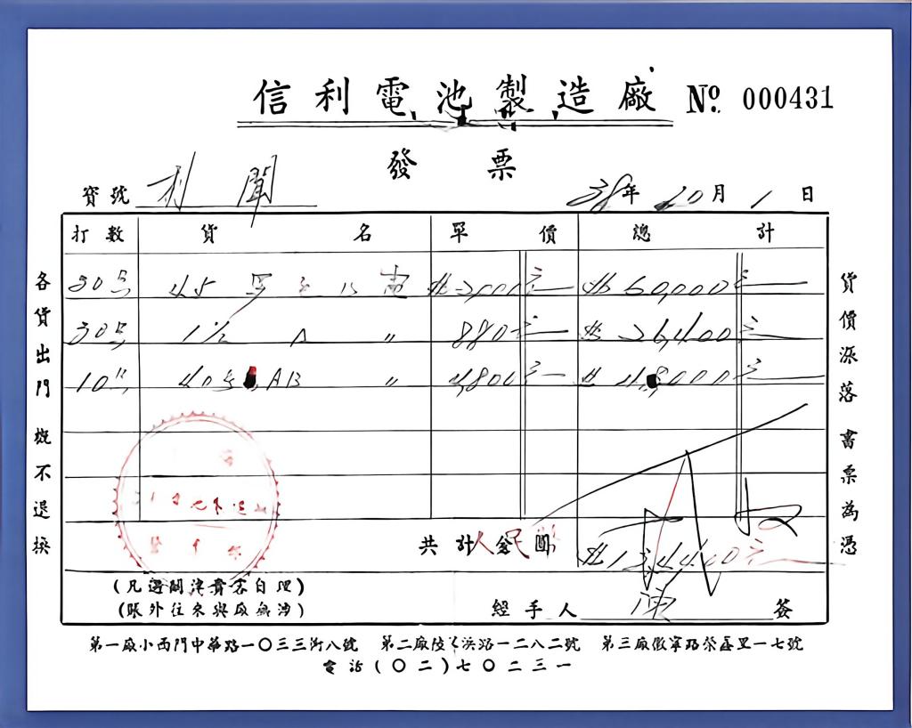 这是一张“信利电池制造厂”发票,纸面已经陈旧,字迹有些模糊。仔细观察,会发现这张票最特别的地方:原来的“金圆券”,被手动改成了“人民币”。