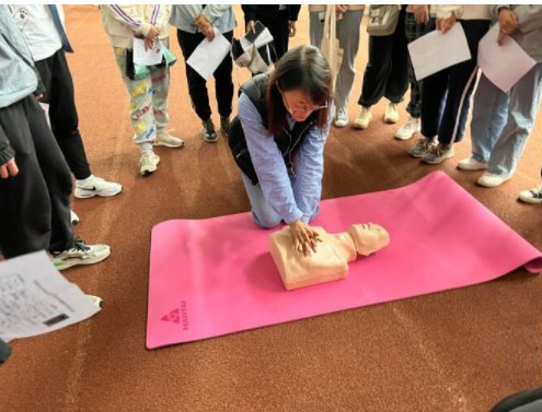 焦瑞超结合自身学习和工作经验,通过PPT讲解、视频观看、真实事例以及现场示范,从救护概论、心肺复苏、创伤救护等方面,向同学们普及急救知识,阐明掌握急救知识的重要性,并让全体学生进行绷带、三角巾包扎训练,手把手指导包扎的操作。在心肺复苏实操中,焦瑞超亲自为大家演示心肺复苏的具体流程,并强调细节,督促同学们反复练习,直至完成考核。
