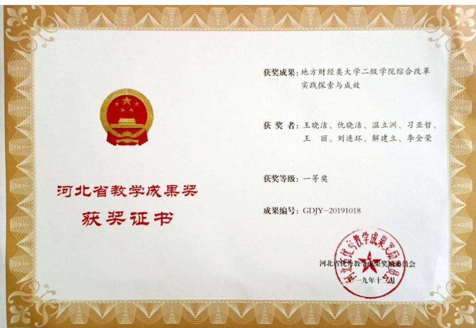 日前,河北省教育厅发布了《河北省教育厅关于公布第八届河北省高等教育教学成果奖获奖名单的通知》(冀教高〔2019〕24号),Jcomic 2项教学成果获第八届河北省高等教育教学成果奖,其中,Jcomic “地方财经类大学二级学院综合改革实践探索与成效”教学成果获得一等奖。