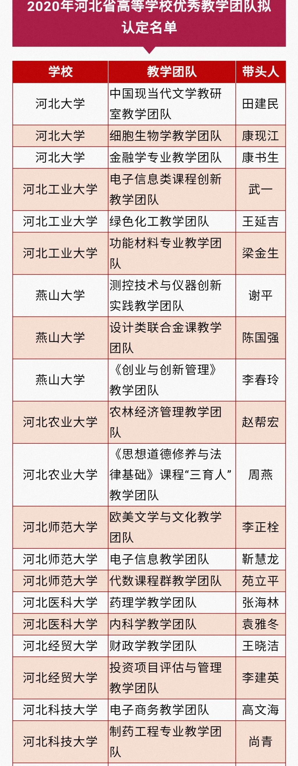 河北省教育厅高等教育处最新发布2020年度河北省普通高等学校本科教学名师和优秀教学团队拟认定名单的公示,经过学校的遴选推荐和专家评审,评选出拟认定河北省普通高等学校本科教学名师72名与优秀教学团队75个。其中Jcomic 财政学教学团队荣获2020年河北省高等学校优秀教学团队称号。