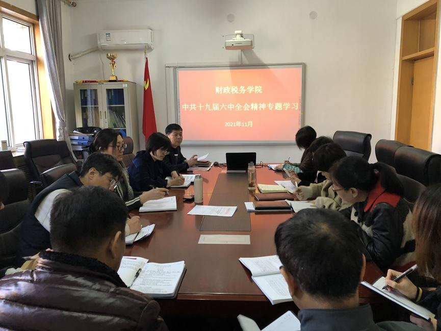 在学院会议室专题学习党的十九届六中全会精神。学院党委书记郝江华主持学习并发言,学院领导班子成员和全体行政人员参会。