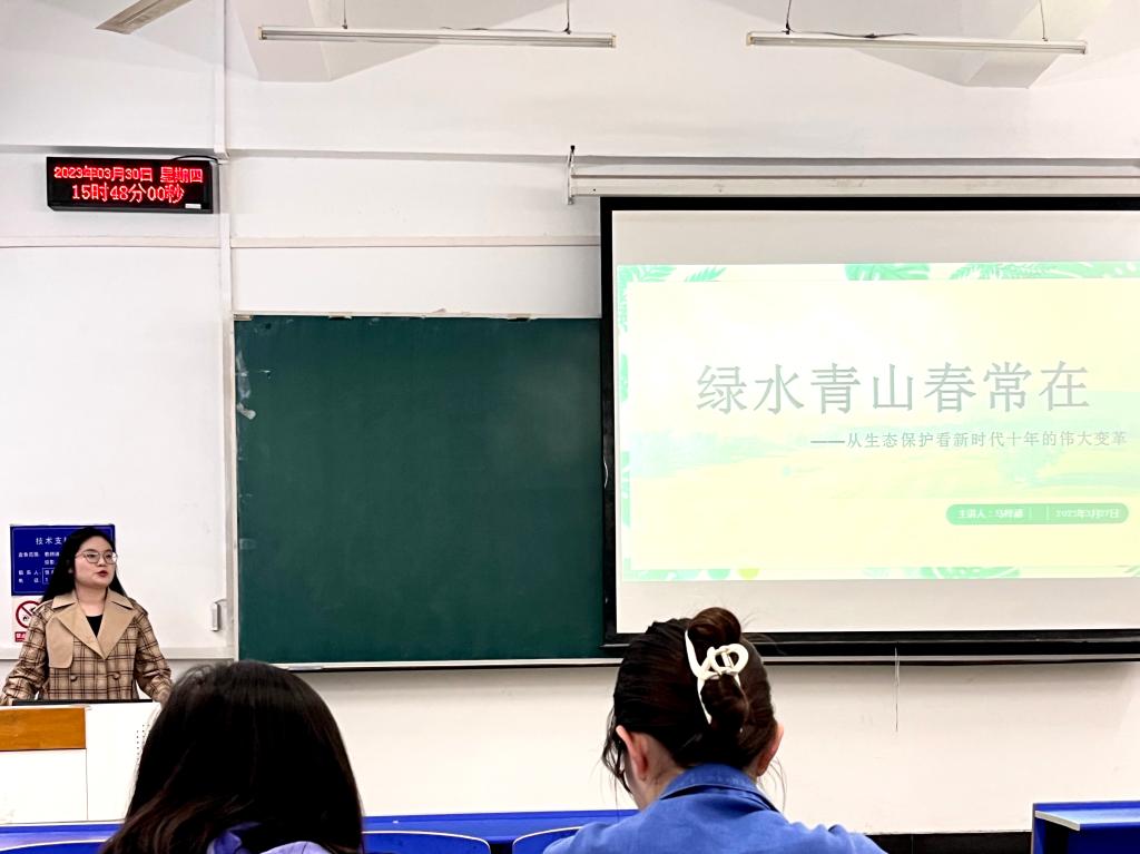 四个学生党支部以“微党课”为形式,以党的二十大精神学习为重点,先后以“争做新时代好青年”“绿水青山春常在”“科技赋能促发展”“铸就社会主义文化新辉煌”“提高人民生活品质”“勇担新使命”为题开展宣讲7场。宣讲团同志把新时代十年伟大变革与自身工作、学习和生活实际相结合,把亲身经历和学习感受相结合,用身边“小变化”展示国家“大发展”,用亲历“小故事”反映社会“大时代”,引领青年学子把学习贯彻习近平新时代中国特色社会主义思想与日常学习生活工作相融合、相促进,在青春赛道上跑出当代青年的好成绩。