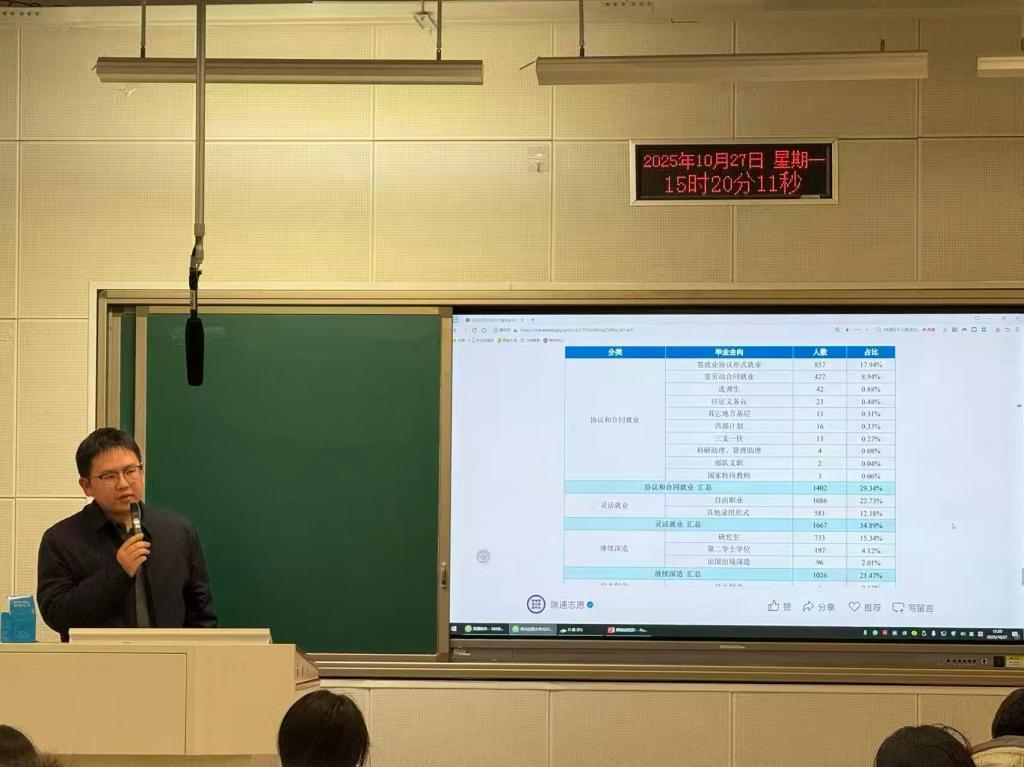 郑铿城老师用“当代青年就业现状”相关数据阐释不同就业维度现状,从结构性就业矛盾突出、高质量岗位竞争激烈两方面说明就业困难的原因。他强调要抓住机遇,一是引导青年在乡村振兴、制造强国、区域协调发展等战略下深入基层;二是在新兴产业升级,传统岗位竞争激烈的背景下,权衡理想与现实的差距,掌握“硬核”新技能。郑铿城老师提到,习近平总书记在党的二十大报告中指出教育、科技、人才的基础性、战略性作用及建设教育强国、科技强国、人才强国的重要思想,为青年践行新使命提供了理论基础。同时以陈家悦、孟雪、关祖苹在不同领域的践行案例,让同学们认识到案例学习是连接理论与现实的桥梁,引导同学们校准自身认知,做出更有远见的职业决策。
