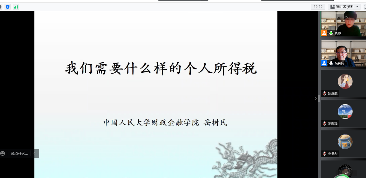 岳树民结合多年来对个人所得税的研究,从“我国现行个人所得税的演进”、“我国现行个人所得税问题分析”、“我国个人所得税改革分析”三个方面系统论述了“我们到底需要什么样的个人所得税”。岳树民首先梳理了我国个人所得税的发展历程,简要介绍个人所得税的七次修订的背景和内容,结合个人所得税的相关数据讲解了“我国现行个人所得的样子”。随后,岳树民论述了我国现行个人所得税制的主要问题及其导致的后果,并说明未来个人所得税的改革方向以及改革过程中需考虑的问题。最后,他指出个人所得税改革是我国下一步税制改革的一个主要税种,要充分发挥个人所得税的作用,从而服务于共同富裕这一大目标。讲座结束后,岳树民与参会师生就相关问题进行交流讨论,现场气氛热烈。