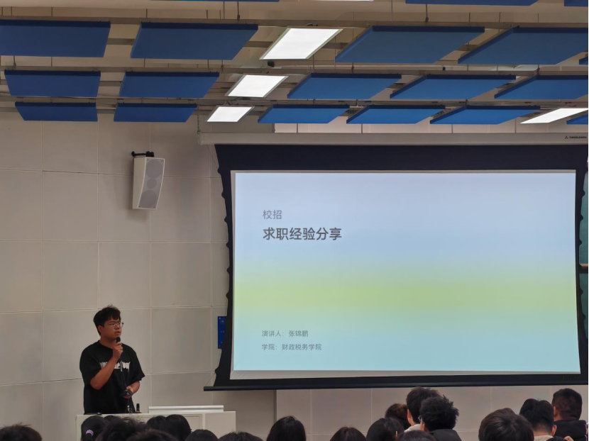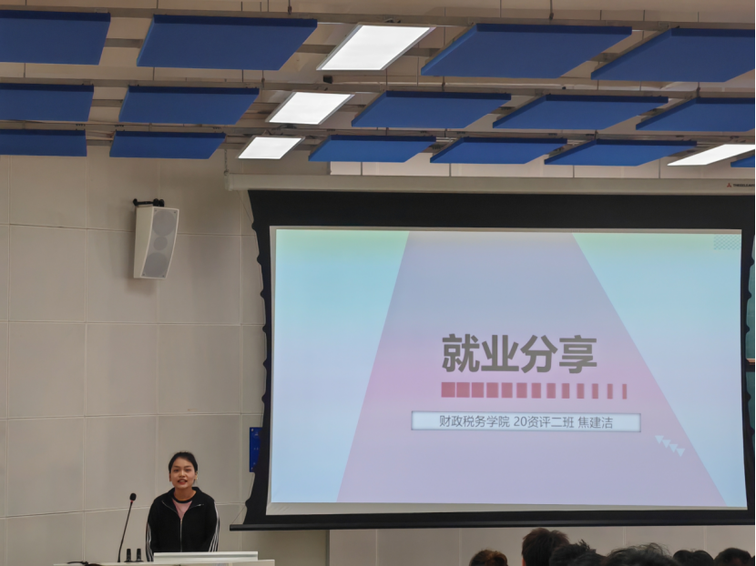 焦建洁分享了申请银行工作的经验。她从自己为什么选择银行、银行的招聘流程、网申注意事项等方面进行了讲解。她告诉同学们如果打算就业就要多去实习实践,积累经验,为自己以后的工作打下基础,提升竞争力。