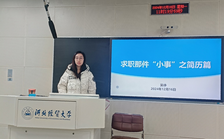 吴峥从“简历、求职邮件、实习实践”三个方面为学生深入讲解了简历制作的方法与注意事项,提醒同学注意职邮件的主题和简历命名格式。吴峥建议学生以表格形式记录自己的面试进度。鼓励学生多参与实习,考取资产评估师、初级会计证等相关证书,提高自身竞争力;积极参加求职就业讲座和比赛,锻炼面试能力。