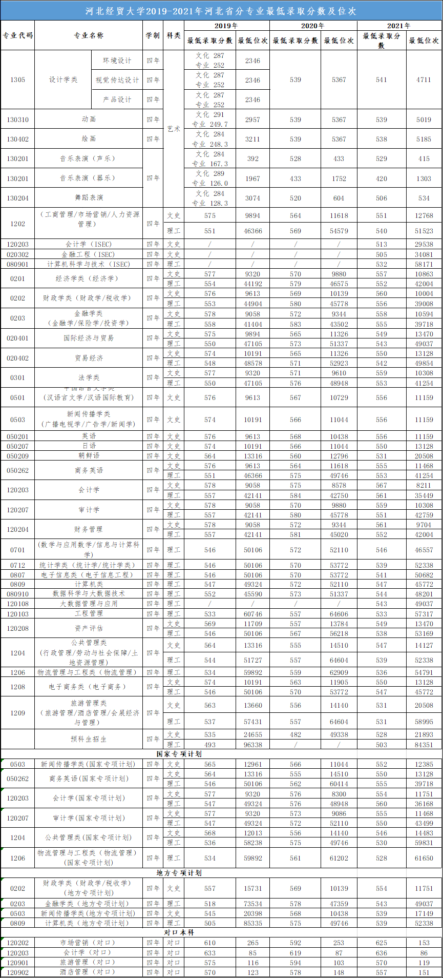 河北经贸大学2019-2021年河北省内分专业录取情况